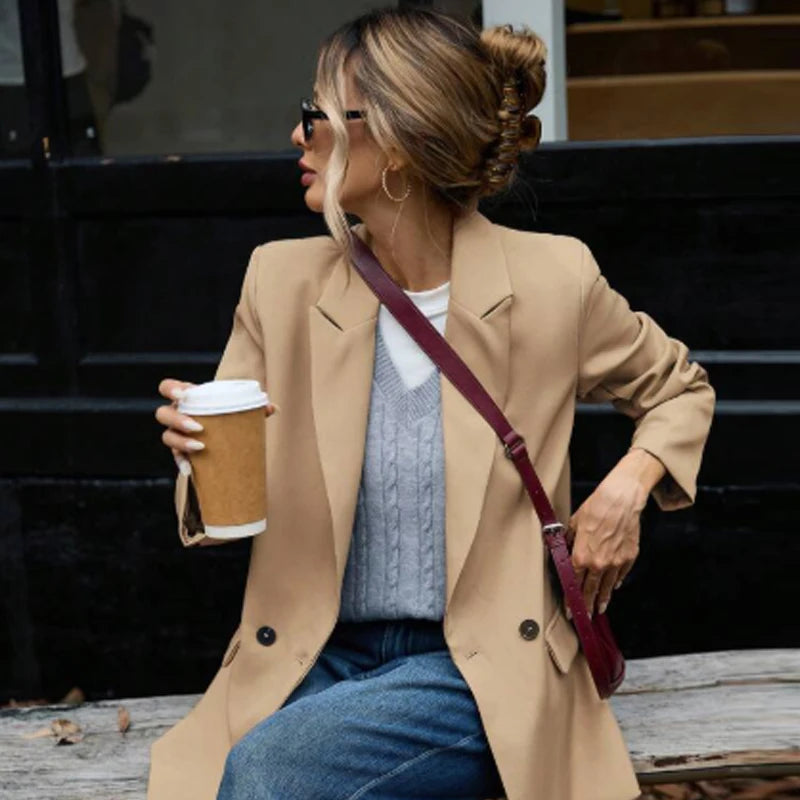An effortless, double-breasted longline that dresses everything up without trying. Cut from a lightweight polyester-blend, it balances soft tailoring with a relaxed silhouette so you get quiet polish whether you’re headed to the office, coffee, or an evening out. Breathable and thin enough for layering, the blazer arrives in timeless camel, khaki, beige and black to anchor every outfit.
