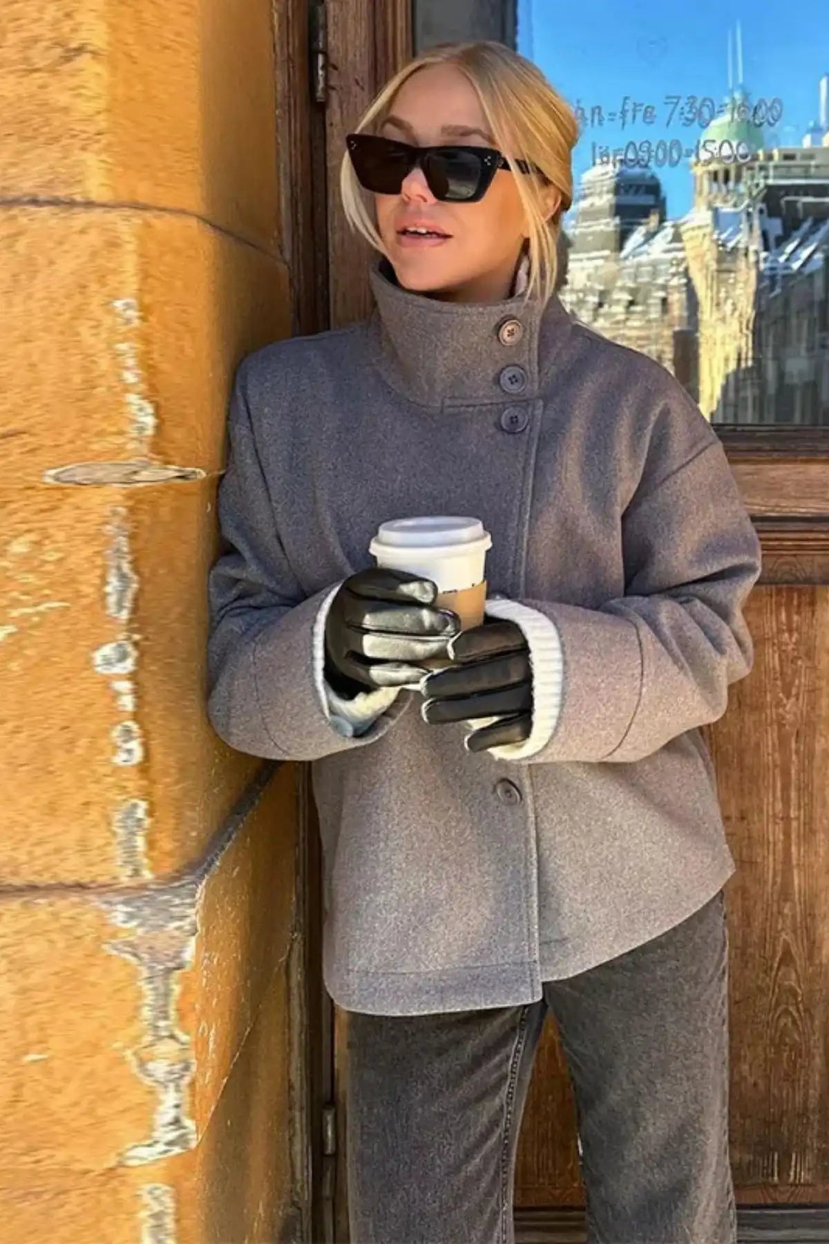 Style: Double-breasted short jacket — boxy, relaxed silhouette